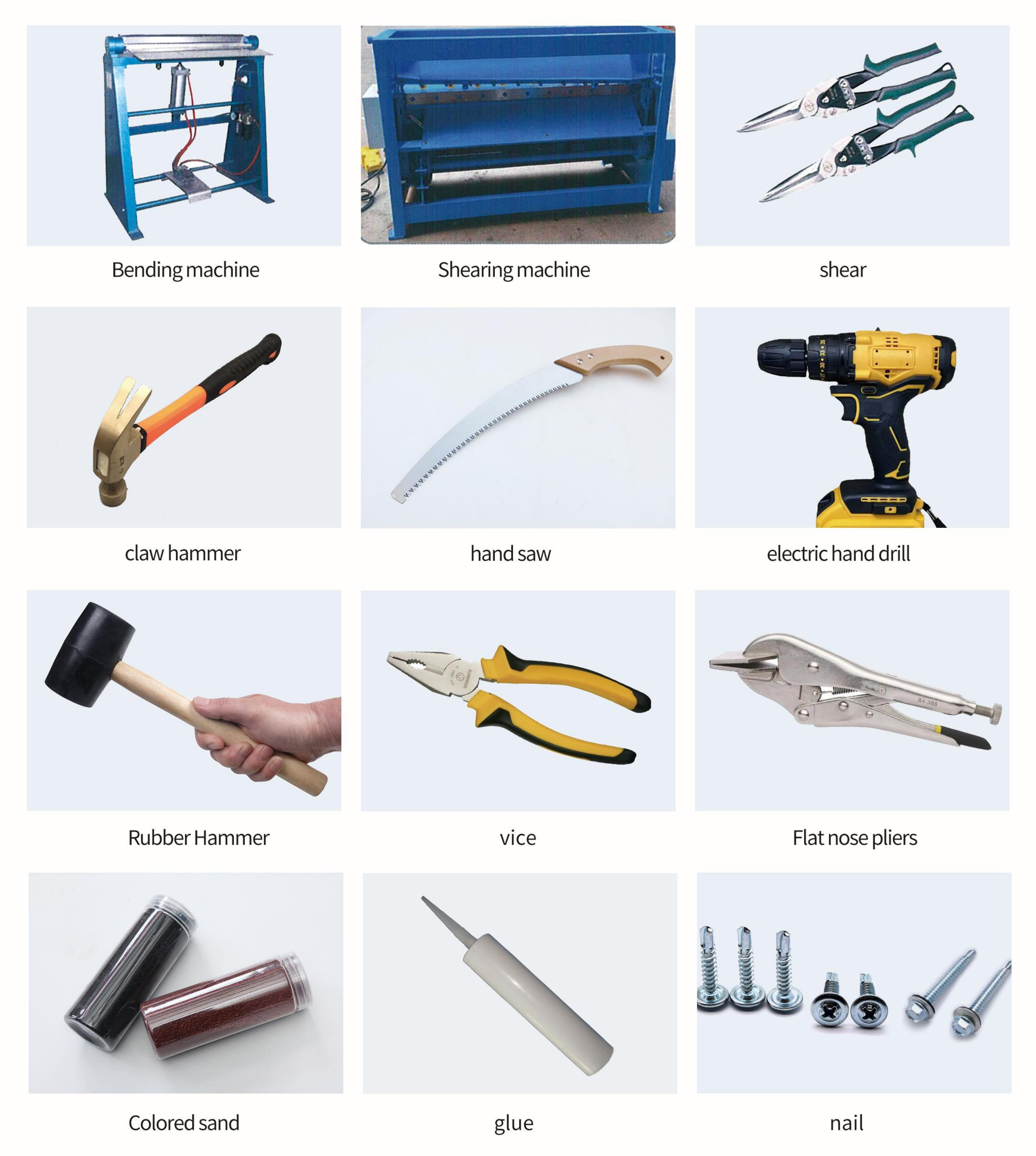 | Materiales | Chapa de acero galvanizado/Arena coloreada/Resina acrílica |