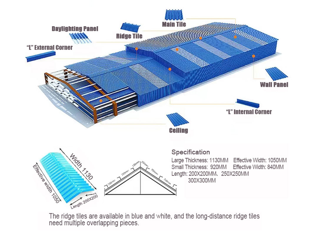 5-30 años de durabilidad Las baldosas UV-PVC están hechas principalmente de resina de cloruro de polivinilo (pvc), agente anti-ultravioleta UV-P, antioxidantes y retardantes de llama como materias primas. Debido a que su sección transversal es consistente, se puede utilizar para uso en techos de arco, tiene resistencia a ácidos y álcalis y rendimiento de carga, y rendimiento retardante de llama a altas temperaturas, por lo que se usa ampliamente en todo tipo de techos de fábricas de gran envergadura, su modelo y la evaluación comparativa de modelos de tejas de acero y tejas de acero de color también pueden estar hechos de material compuesto hueco para paredes y techos. Su ancho es principalmente: 840,900,980,1050 mm, cada ancho, altura de onda y sección transversal son diferentes, adecuados para diferentes escenas de techos.